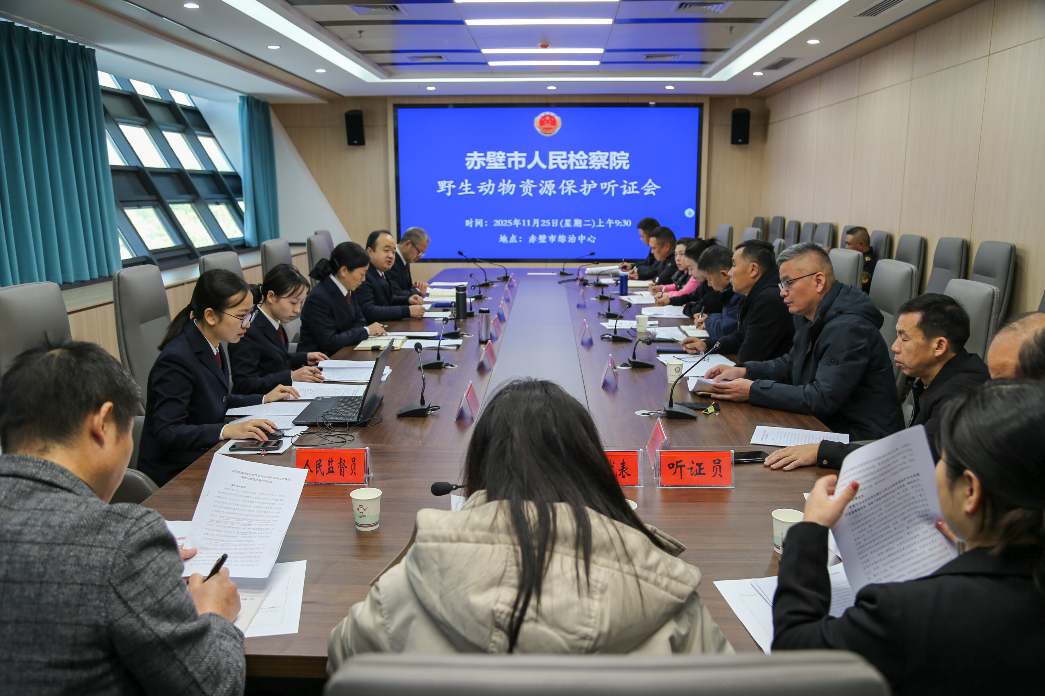 2025年11月25日,由赤壁市检察院党组书记、检察长陈顺练主持召开野生动物保护行政公益诉讼公开听证会。人大代表、律师、人民监督员、“益心为公”志愿者及相关单位负责人共同参与。